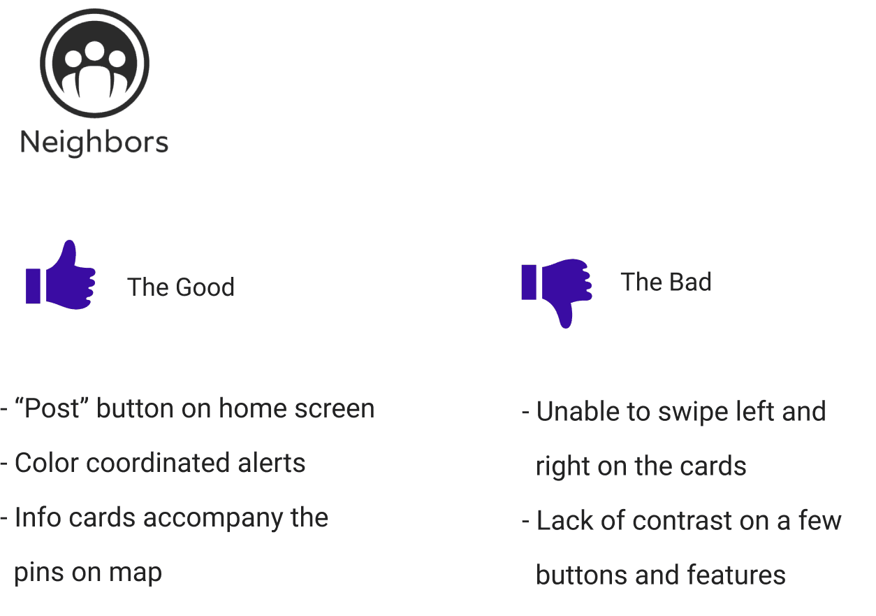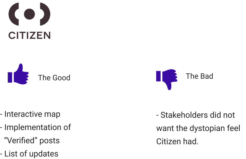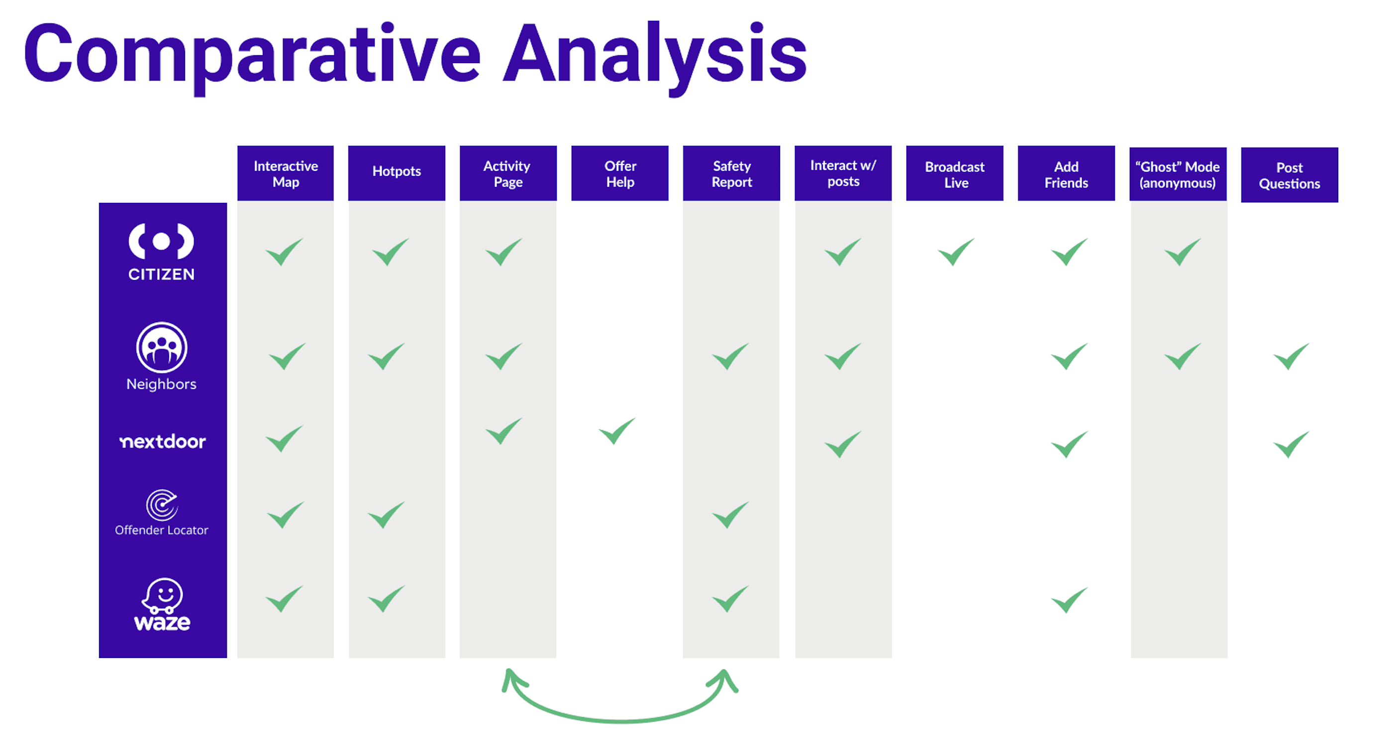 We didn't really have any direct competitors so we went ahead and performed a comparative analysis, highlighting features we thought would give value to Averto (if not already existing on the beta version). All the features highlighted in grey were implemented in our designs, combining the Activity Page with Safety Report amongst others.