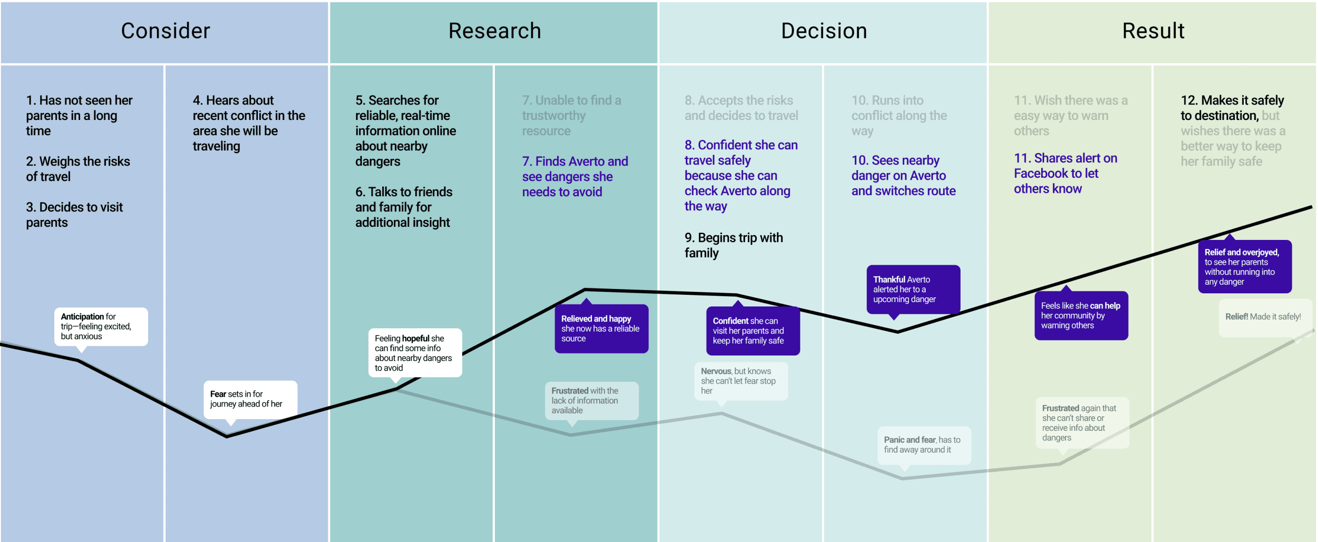 In this journey map, our user would like to visit her family out of town, she wants to be aware of threats along the way, in order to make it safely to her destination. With the use of the Averto app this alleviates pain points along the way.