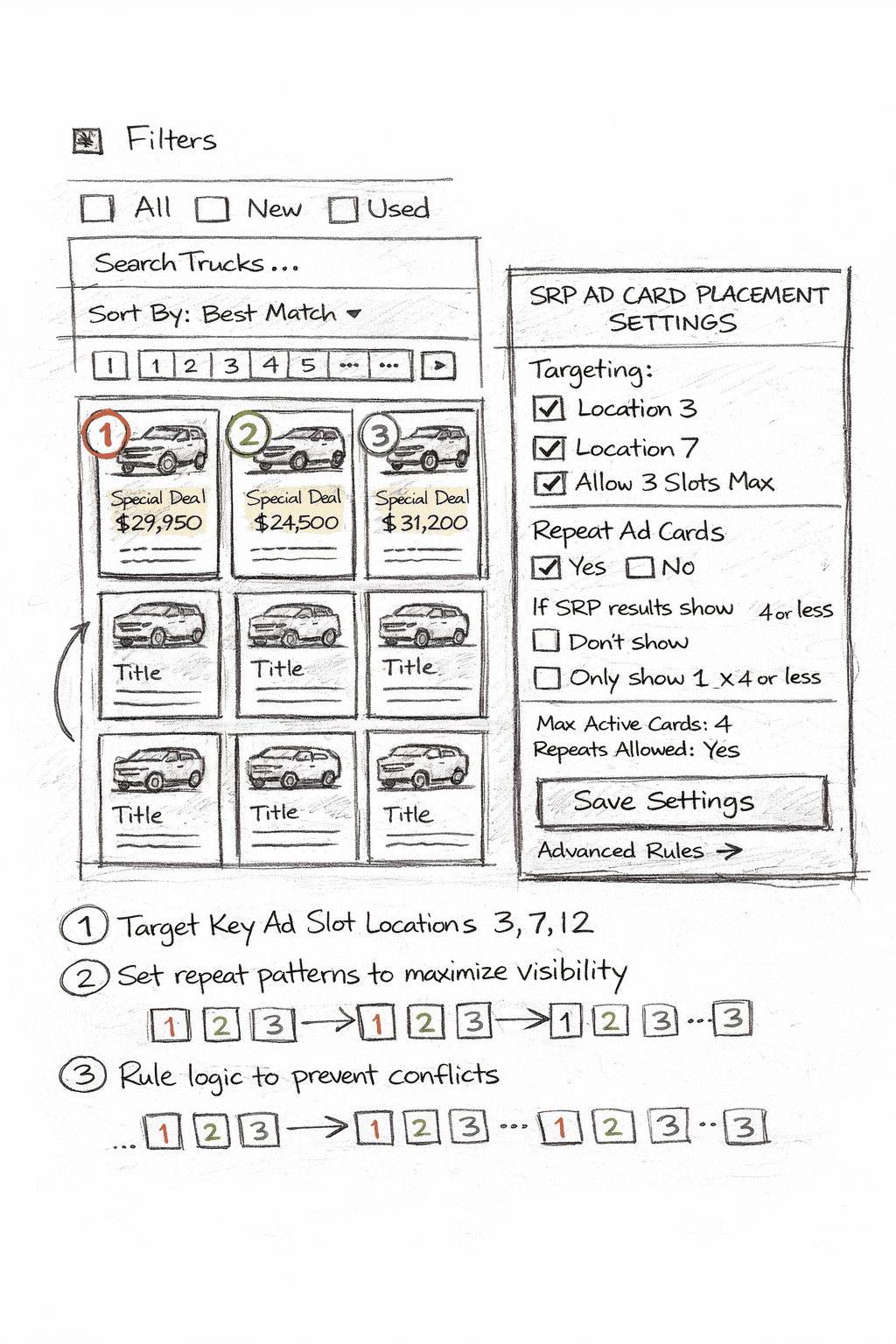 During later testing phases, we reached a critical moment where the team determined that the original configurable placement system would introduce too much operational complexity. Although I had invested significant design effort into the settings interface, I worked with product leadership to pivot toward a simplified model that used a small set of predefined ad card locations instead. This shift allowed us to maintain the core value of Signals—behavior-driven inventory promotion—while ensuring the feature could launch reliably and scale across dealership websites. By adapting the design and focusing on a pragmatic solution, we were able to deliver a stable and effective product while setting a foundation for future iteration.