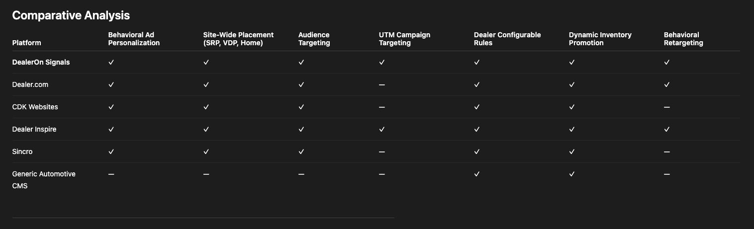 Most competitors focused on static inventory promotion, revealing an opportunity for DealerOn to differentiate through behavior-driven personalization and dynamic ad placement.
